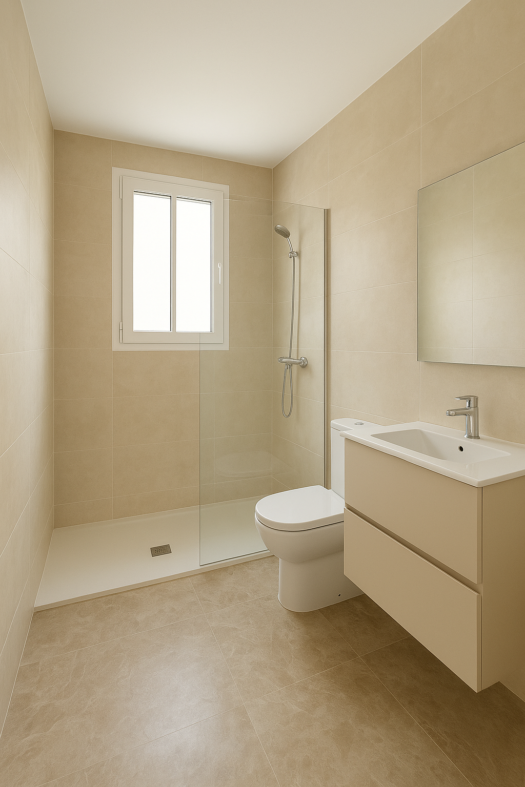 Instalaciones completas para lavadora y lavavajillas. Sanitarios con cisternas de bajo consumo, griferías monomando y termostáticas, y platos de ducha.