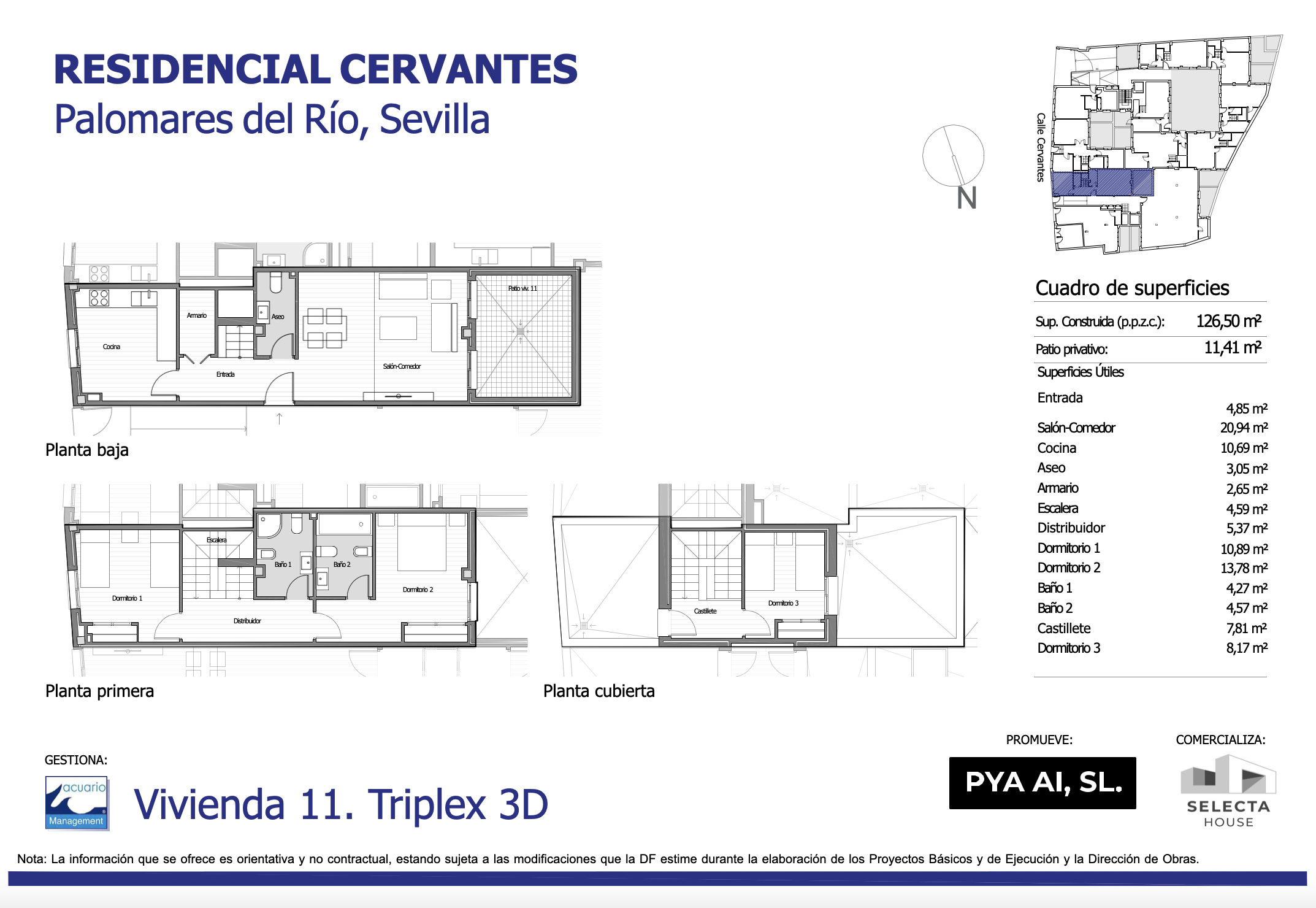 Vivienda Residencial Cervantes Palomares del Río: vivienda de tipología Tríplex distribuida en planta baja con hall de entrada, salón comedor, aseo, armario, cocina y patio, en planta primera cuenta con distribuidor, dos dormitorios y dos baños completos, y en planta de cubierta dispone de castillete y un tercer dormitorio además de un solárium de uso exclusivo. Tiene una superficie construida con parte proporcional de elementos comunes de 126,50 m². El patio privativo de planta baja tiene una superficie de 11,41 m² y el solárium en cubierta de 10,35 m². En el precio está incluida una plaza de garaje situada en la planta sótano del edificio.